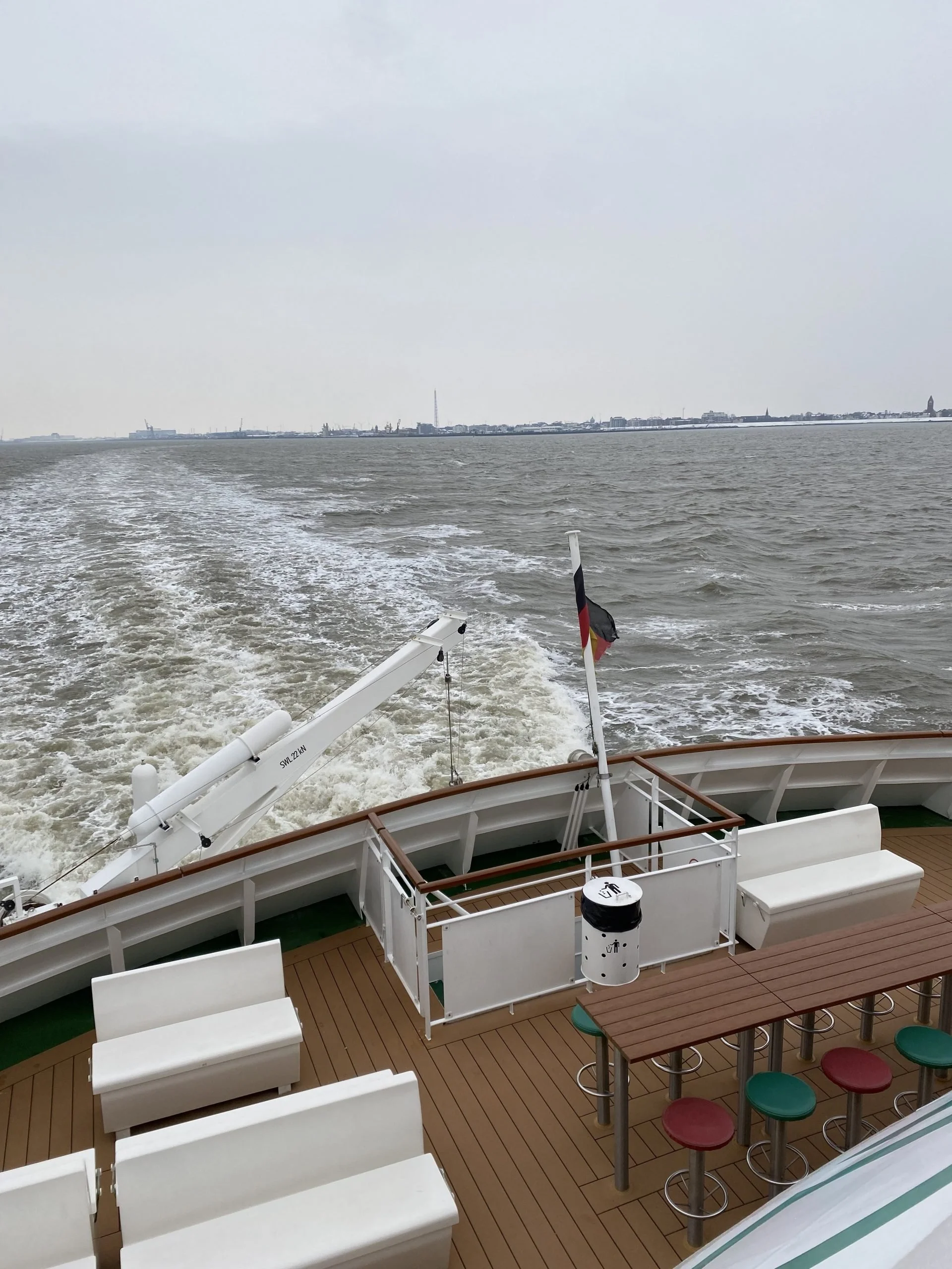 Trotz stürmischen Wetters (aus Sicht einer Landratte), ist die Fahrt recht ruhig. Und natürlich darf ein Blick zurück nicht fehlen. An dieser Stelle muss noch gesagt werden, dass das Wetter besser als erwartet war - kein Regen.